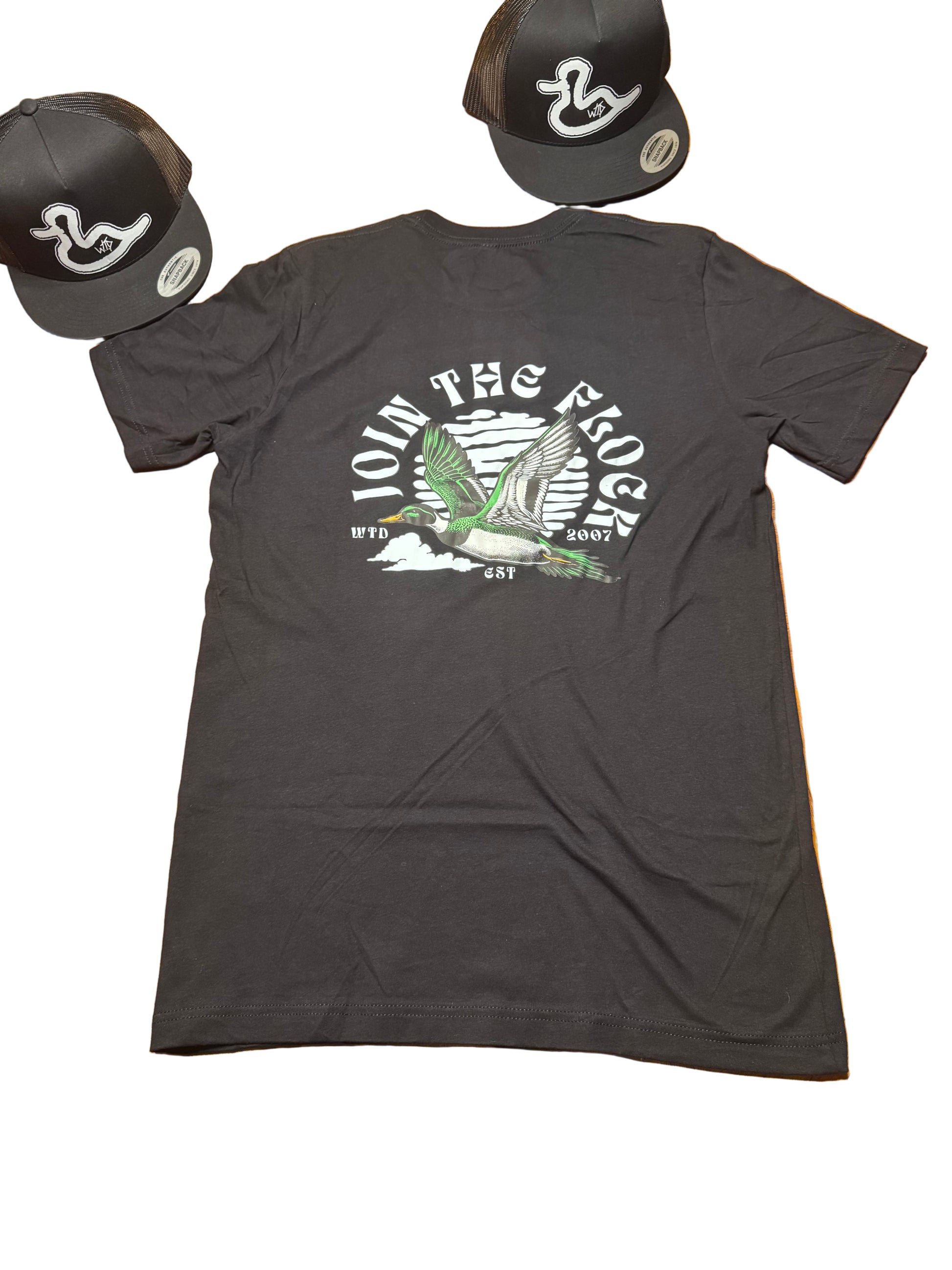Step into the flock and wear your story with pride. The Join the Flock Tee features a heart-shaped What The Duck Apparel mark over the chest — a nod to passion and connection. On the back, bold Join the Flock artwork showcases a duck in a sunset with Est. 2007, honoring where it all began.